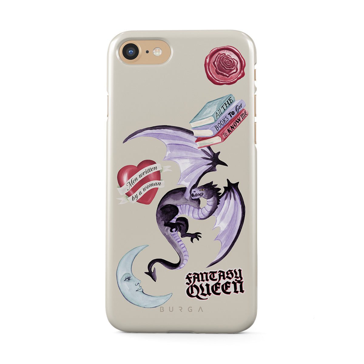 Dizaino ypatybės: violetinis drakonas, lipdukas „Fantasy Queen“, pusmėnulis, violetinis vaško antspaudas, širdis su žinute, knygos