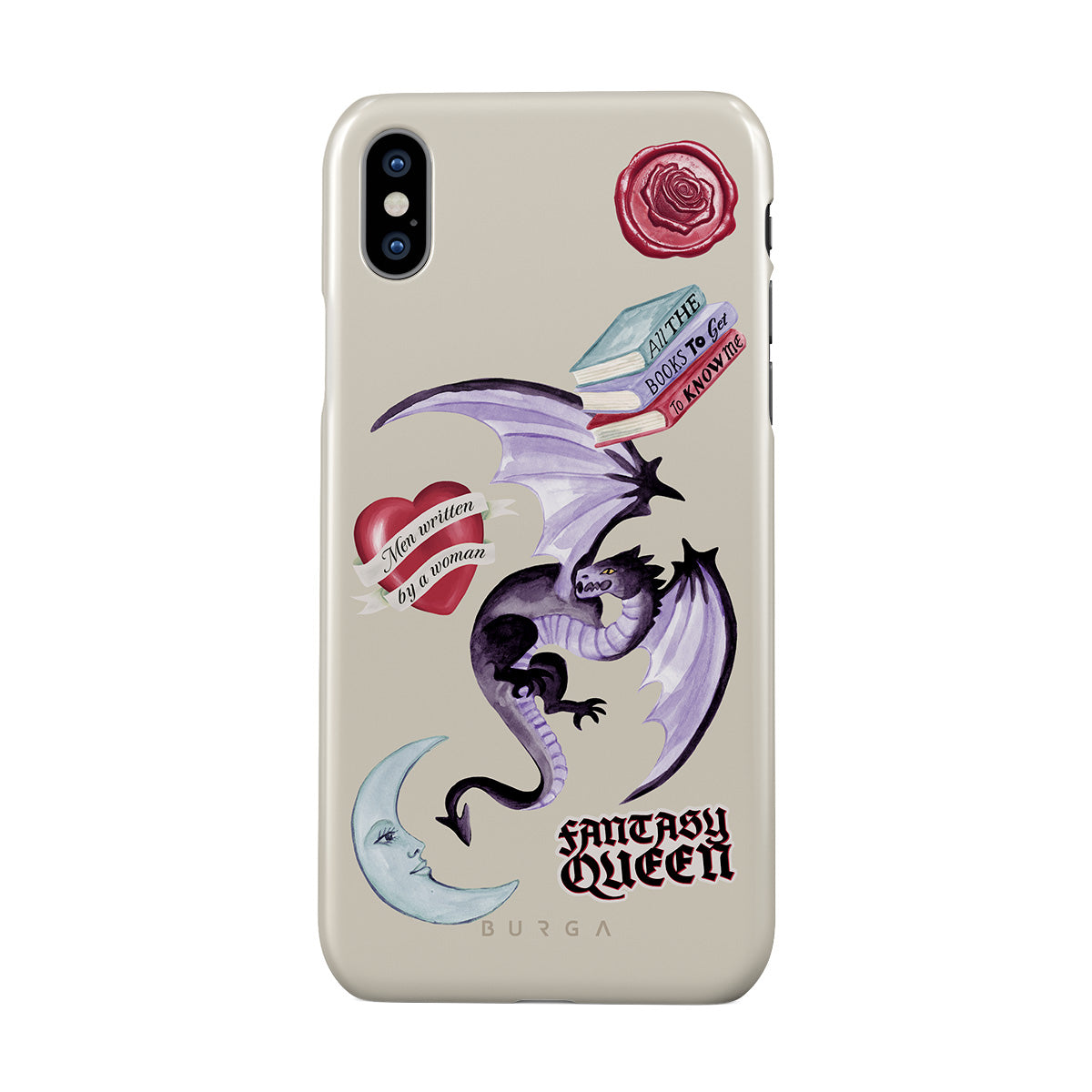 Dizaino ypatybės: violetinis drakonas, lipdukas „Fantasy Queen“, pusmėnulis, violetinis vaško antspaudas, širdis su žinute, knygos