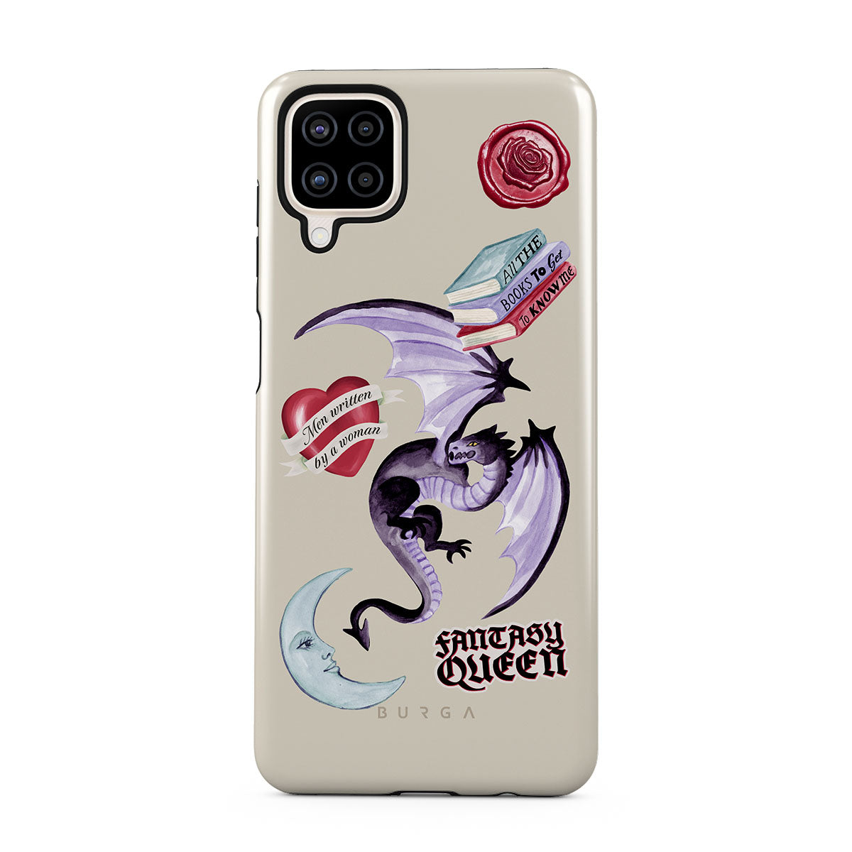 Dizaino ypatybės: violetinis drakonas, lipdukas „Fantasy Queen“, pusmėnulis, violetinis vaško antspaudas, širdis su žinute, knygos