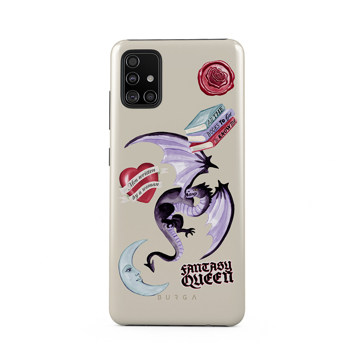Dizaino ypatybės: violetinis drakonas, lipdukas „Fantasy Queen“, pusmėnulis, violetinis vaško antspaudas, širdis su žinute, knygos