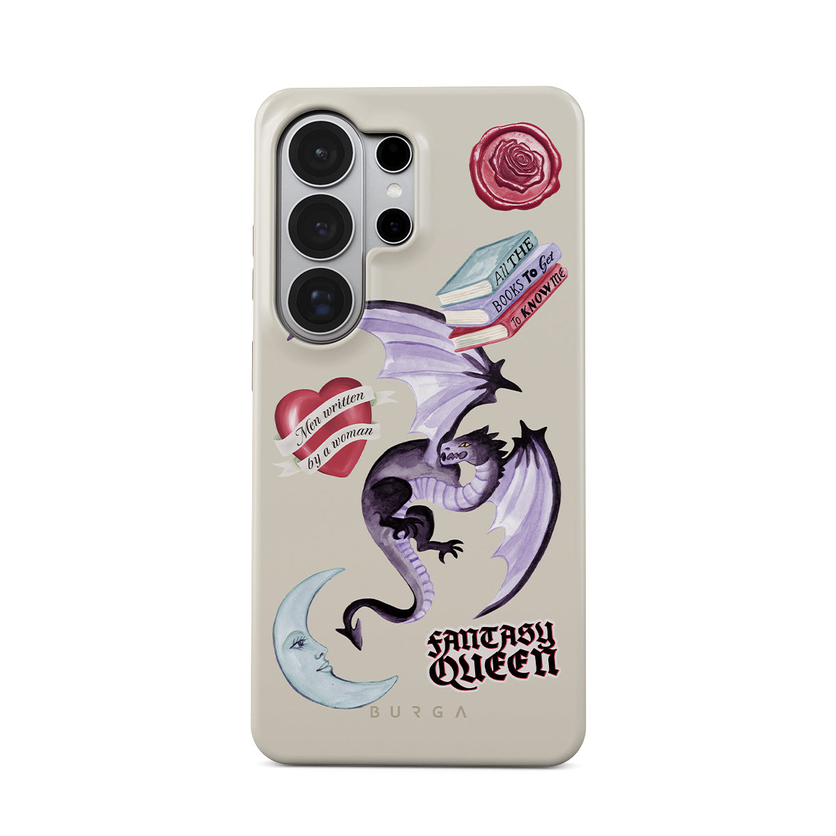 Dizaino ypatybės: violetinis drakonas, lipdukas „Fantasy Queen“, pusmėnulis, violetinis vaško antspaudas, širdis su žinute, knygos