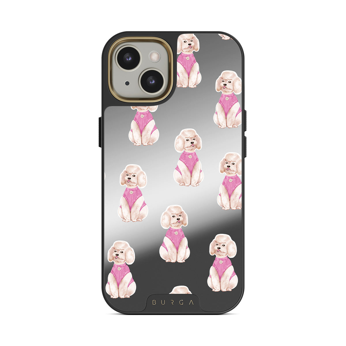 Dizaino ypatybės: pudeliai, šunys, augintiniai, rožinės spalvos detalės, veidrodis