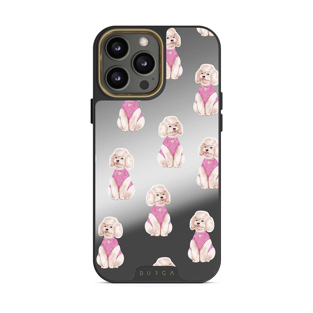 Dizaino ypatybės: pudeliai, šunys, augintiniai, rožinės spalvos detalės, veidrodis
