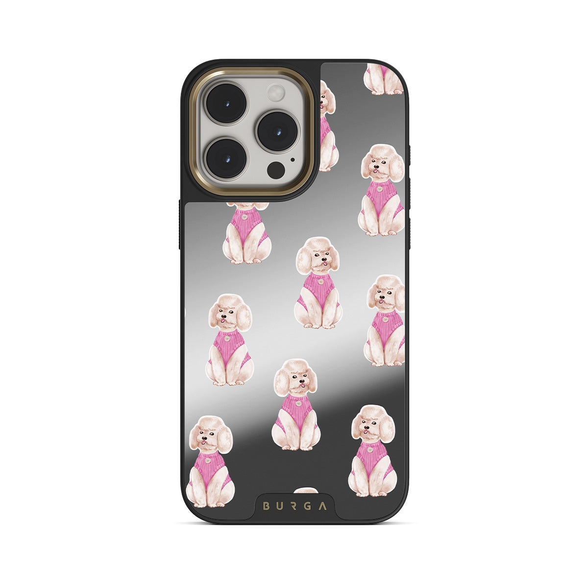 Dizaino ypatybės: pudeliai, šunys, augintiniai, rožinės spalvos detalės, veidrodis