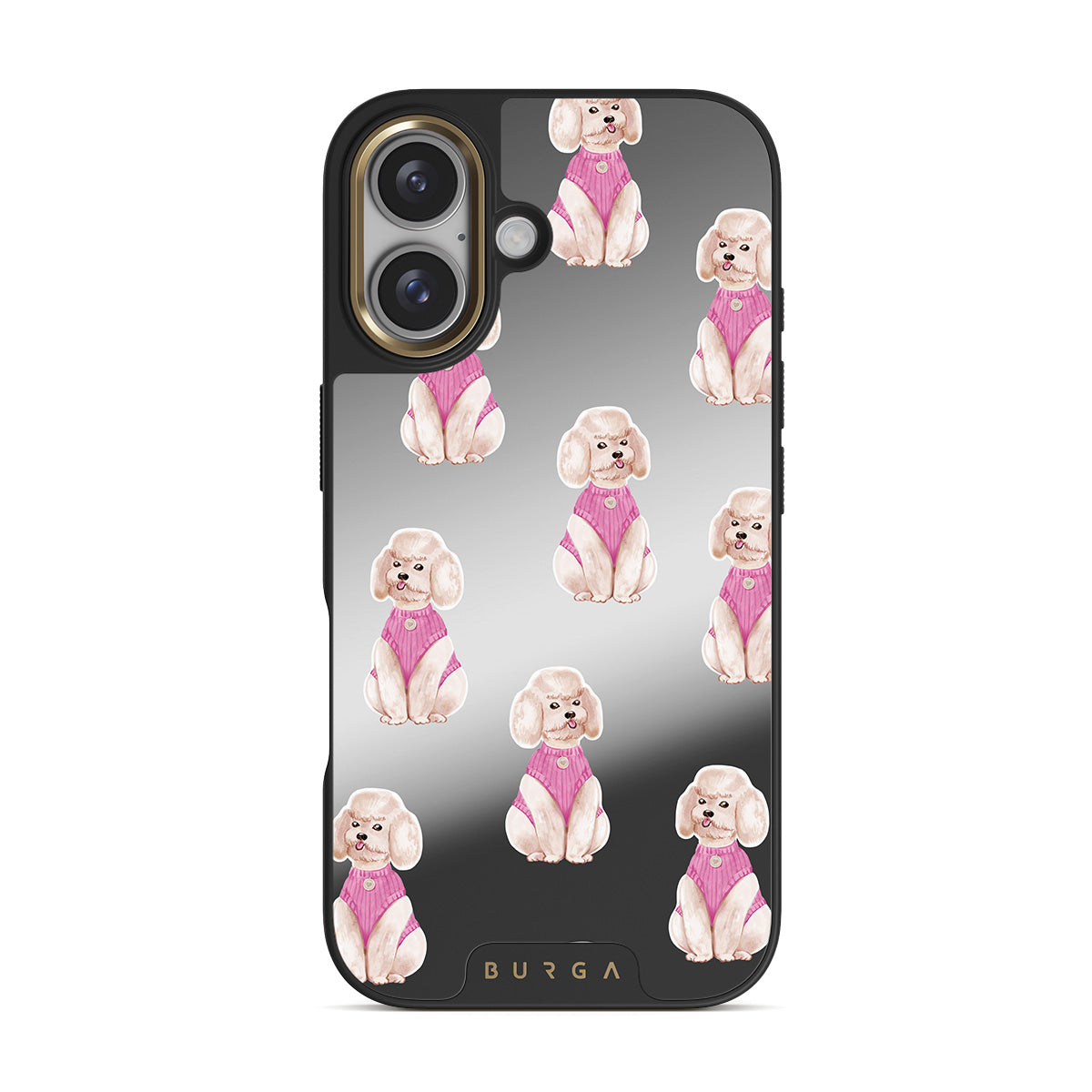 Dizaino ypatybės: pudeliai, šunys, augintiniai, rožinės spalvos detalės, veidrodis