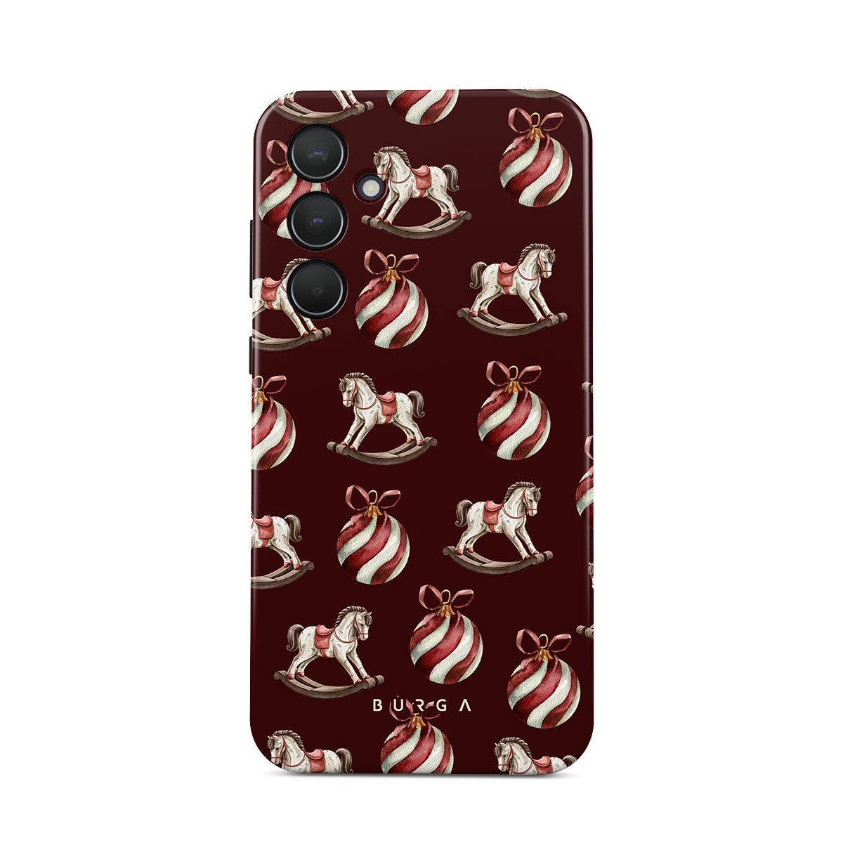 Dizaino ypatybės: supamieji arkliukai, žaisliukai, raudona spalva, kalėdinis raštas.