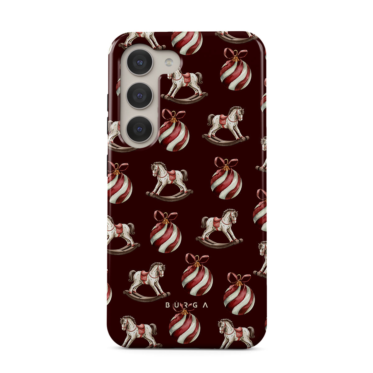 Dizaino ypatybės: supamieji arkliukai, žaisliukai, raudona spalva, kalėdinis raštas.