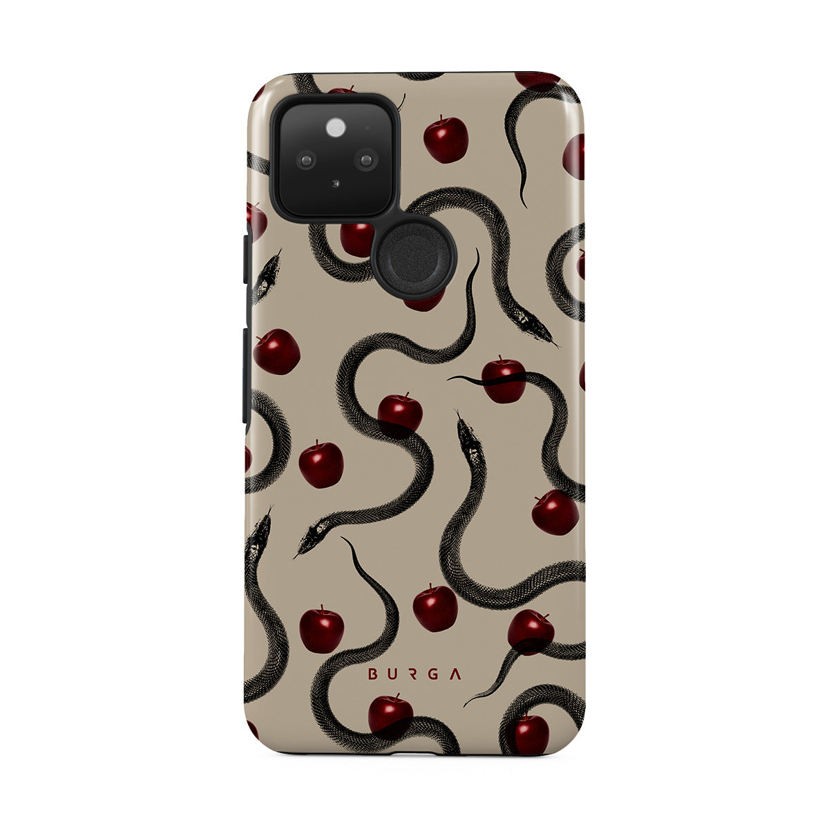 Dizaino ypatybės: blizgantys raudoni obuoliai, susisukusios gyvatės, smėlio atspalviai