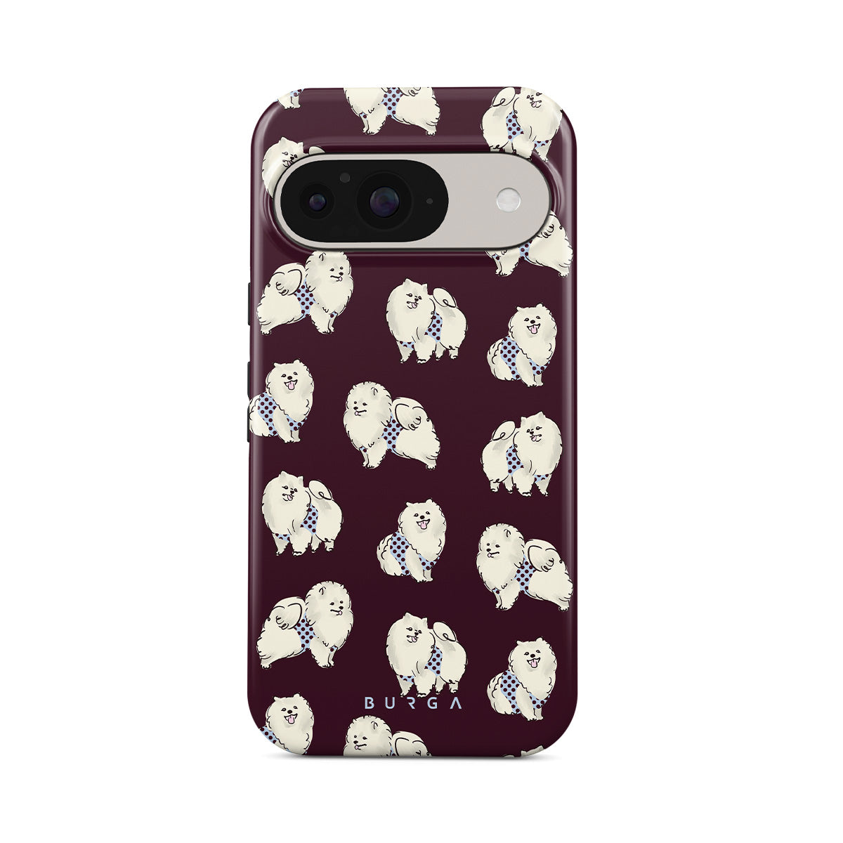 Dizaino ypatybės: balti pūkuoti šunys, pudeliai, tamsiai bordo fonas