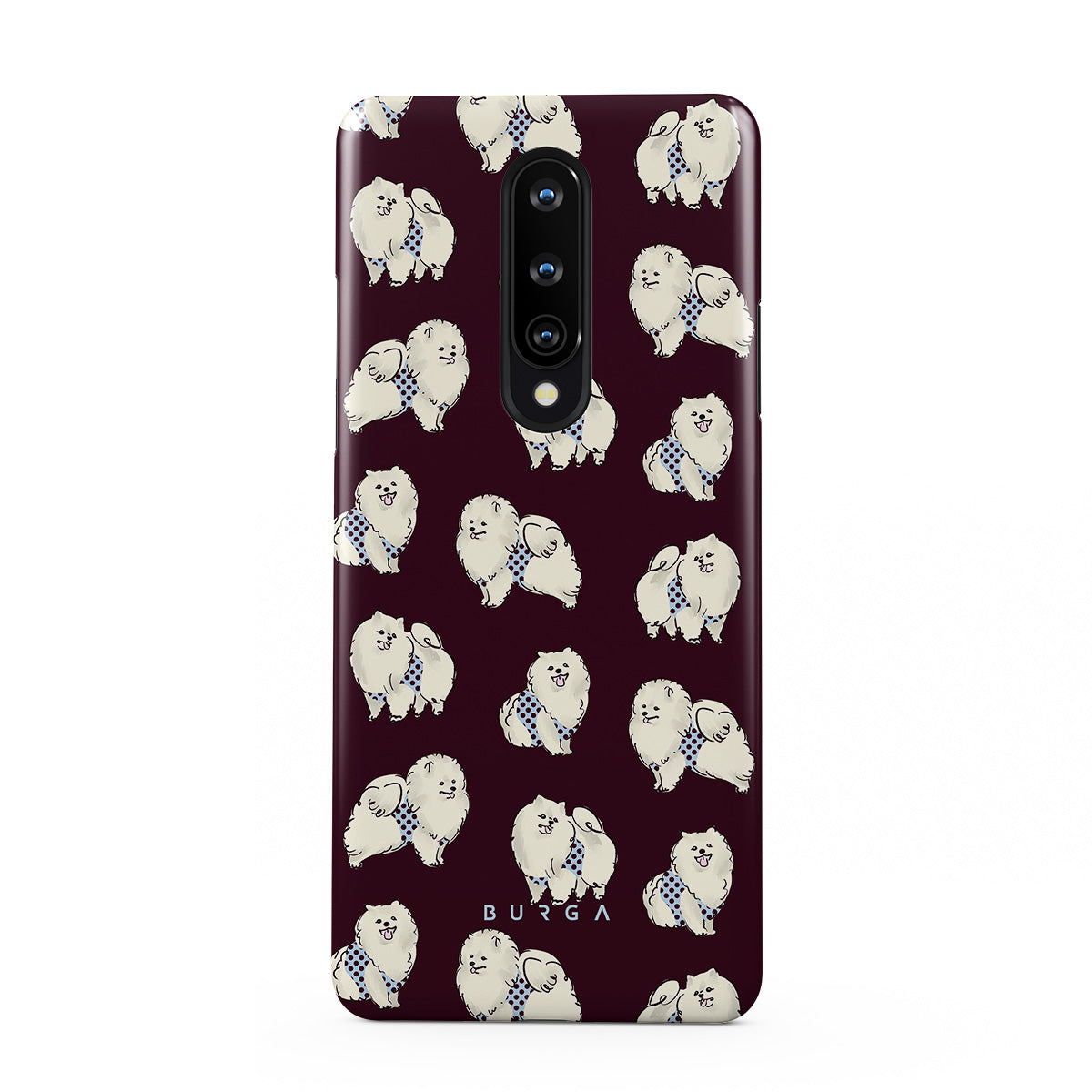 Dizaino ypatybės: balti pūkuoti šunys, pudeliai, tamsiai bordo fonas