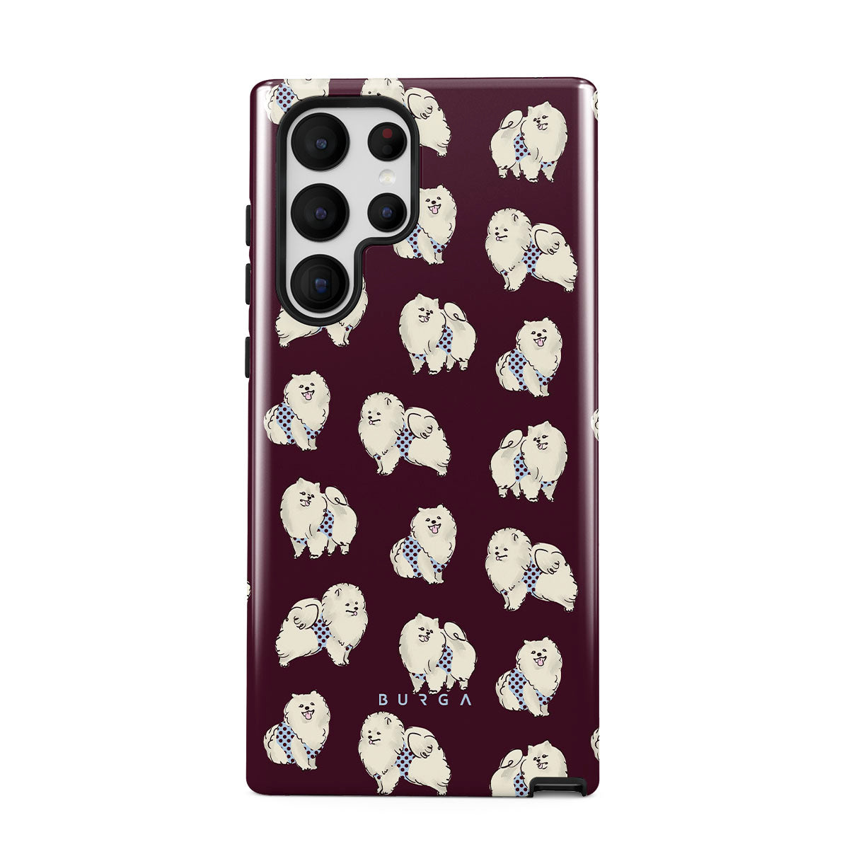 Dizaino ypatybės: balti pūkuoti šunys, pudeliai, tamsiai bordo fonas